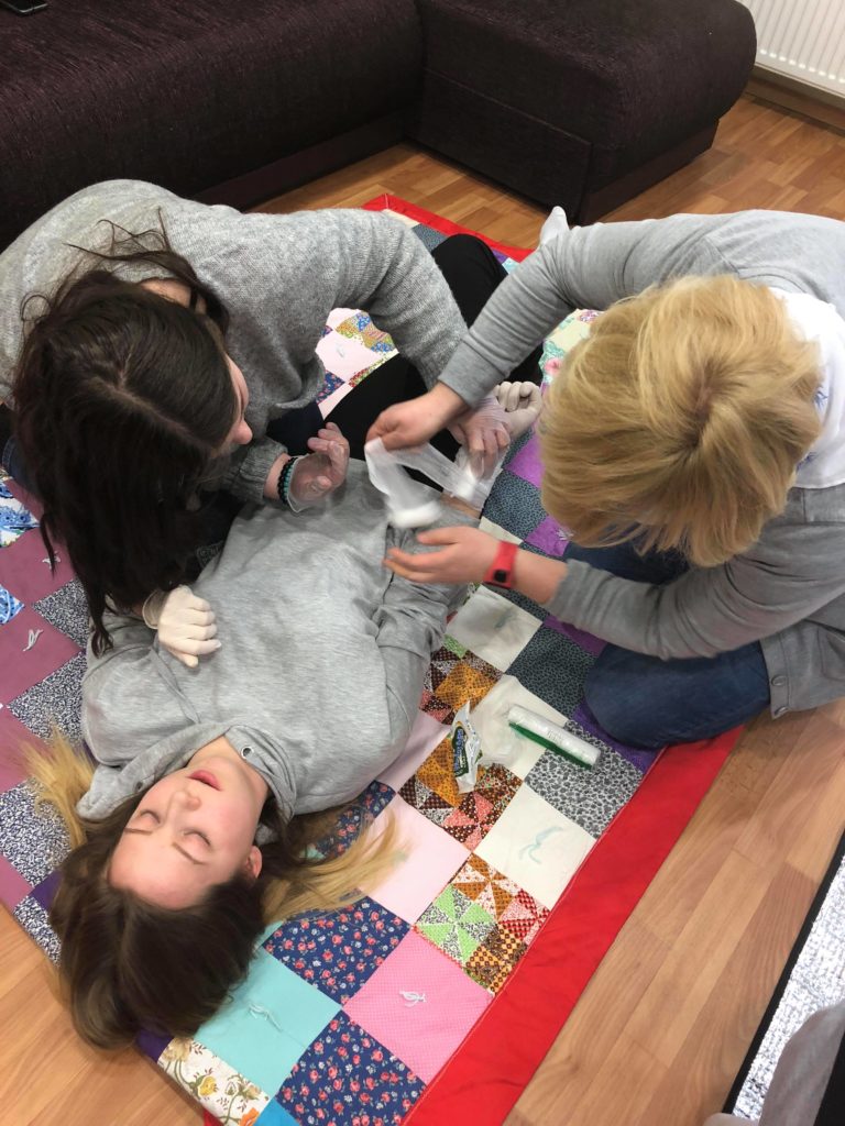LSKJ brīvprātīgie saviem vienaudžiem demonstrēja, kā noguldīt cietušo stabilajā sāna pozā, kā veikt mākslīgo sirds masāžu, kā uzlikt spiedušu pārsēju, lai apturētu dzīvībai bīstamu asiņošanu, kā pareizi iesiet roku trīsstūrveida lakatiņā, kā izvilkt cietušo no mašīnas auto avārijas gadījumā. Šajās PP nodarbībās jaunieši fokusējās uz praktiskām paņēmienu demonstrācijām. Tā LSKJ brīvprātīgie kopā ar Liepas jauniešu centra “Aplesnīns” jauniešiem pavadīja ļoti darbīgu pēcpusdienu.