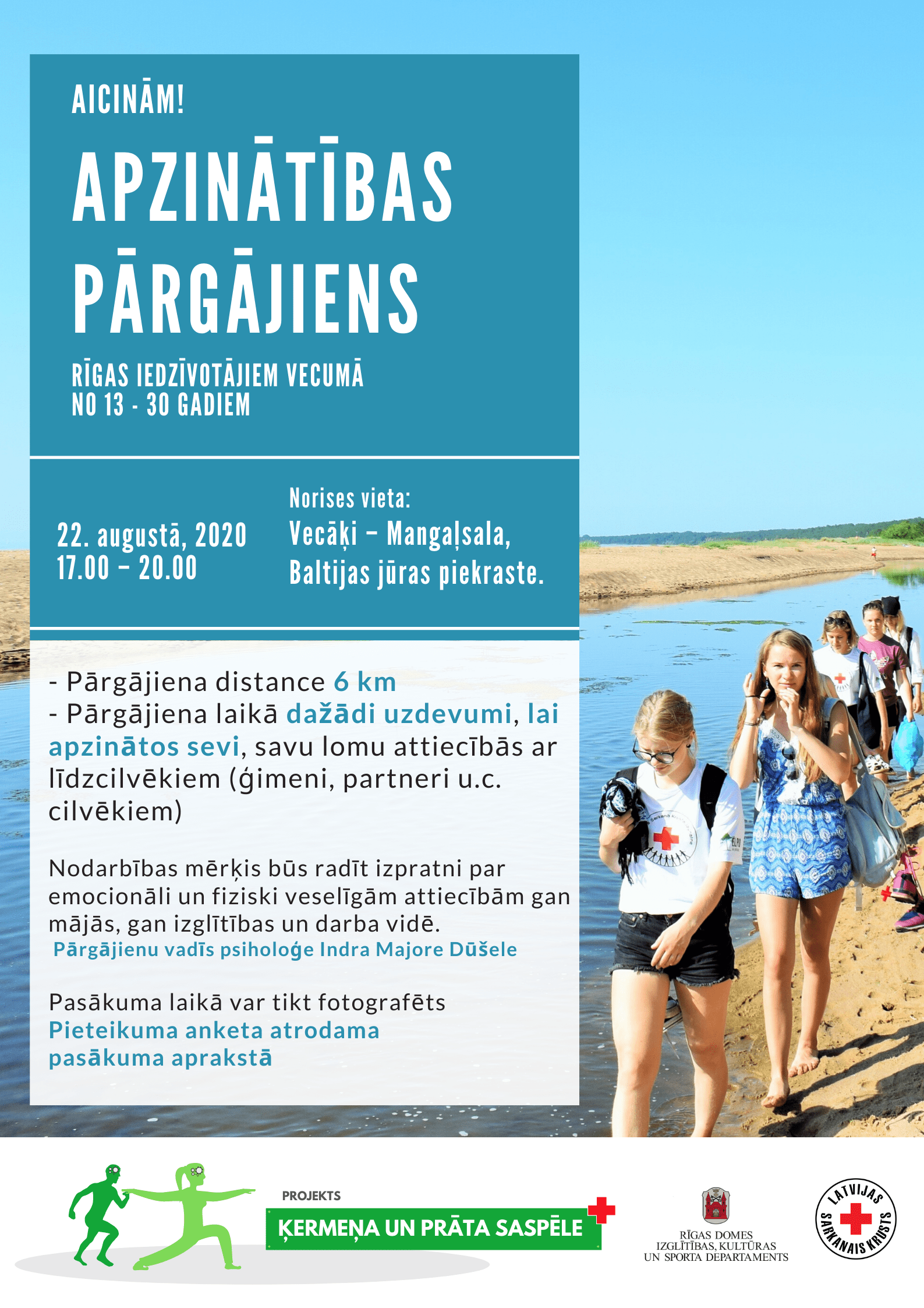 Aicinām Rīgas iedzīvotājus (no 13 līdz 30 gadiem) izmantot lielisku iespēju un 22. augustā piedalīties bezmaksas Apzinātības pārgājienā. kura laikā dalībnieki kopā ar psiholoģi mēros 6 km, lai ar dažādu uzdevumu palīdzību apzinātos sevi un savu lomu attiecībās ar līdzcilvēkiem (ģimeni, partneri u.c. cilvēkiem). Nodarbības mērķis ir radīt jauniešiem izpratni par emocionāli un fiziski veselīgām attiecībām gan mājās, gan izglītības un darba vidē. Apzinātības pārgājienu vadīs psiholoģe Indra Majore Dūšele.