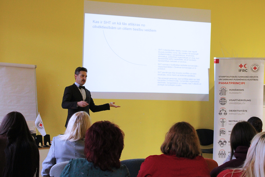 Pirmajā daļā dalībnieki kopā ar zvērinātu advokātu Andri Tauriņu iepazinās ar SHT vēsturi un galvenajiem principiem – humānismu, neitralitāti, objektivitāti un aizsardzību. Tika diskutēts arī par to, kā šos principus integrēt LSK darbā – pirmās palīdzības aktivitātēs skolās, darbā ar jauniešiem un sabiedrības informēšanā.